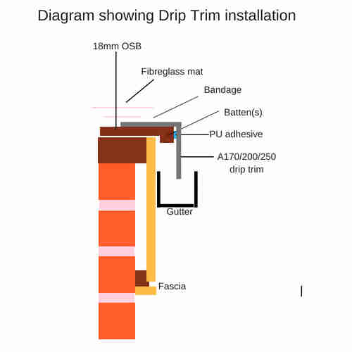 The Drip trim – used at the roofs lowest point directing the water into the gutter. The trim is nailed to the deck, bandaged and a bead of PU adhesive run along the edging batten.