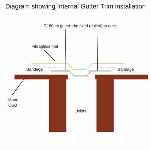 The internal Gutter trim (specialist) – used where internal roof drainage is required. The trim is nailed to the decking and bandaged with the matting running continuously over the gutter.